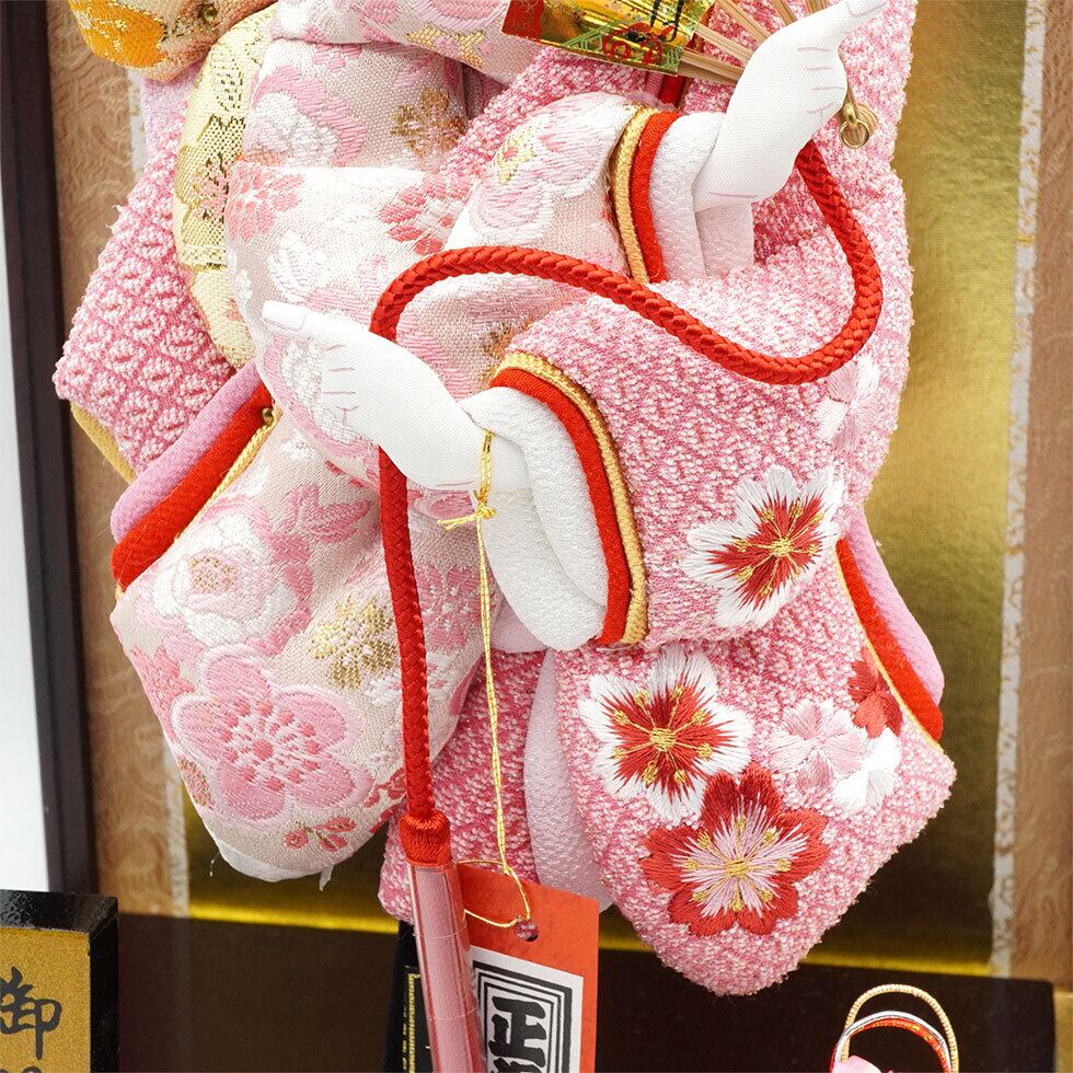 上品な花梨色の戸付きガラスケースにセットしたお飾りです。