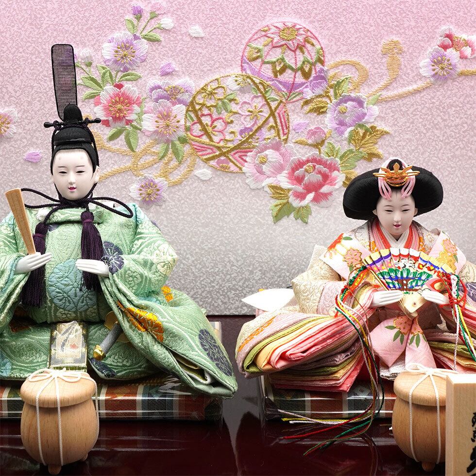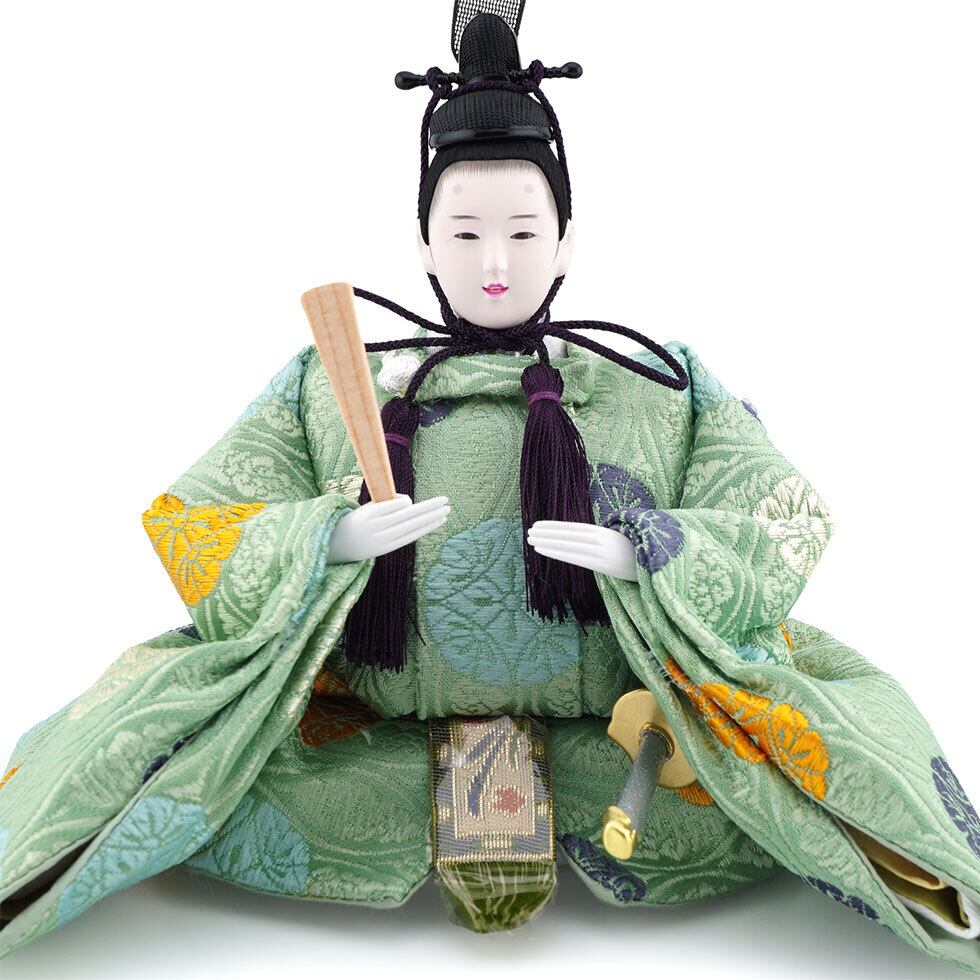 明るく品のある薄緑とベージュ系の金襴をボリューム感のある着付けで仕立てた親王が豪華で見栄えのするお雛様です。