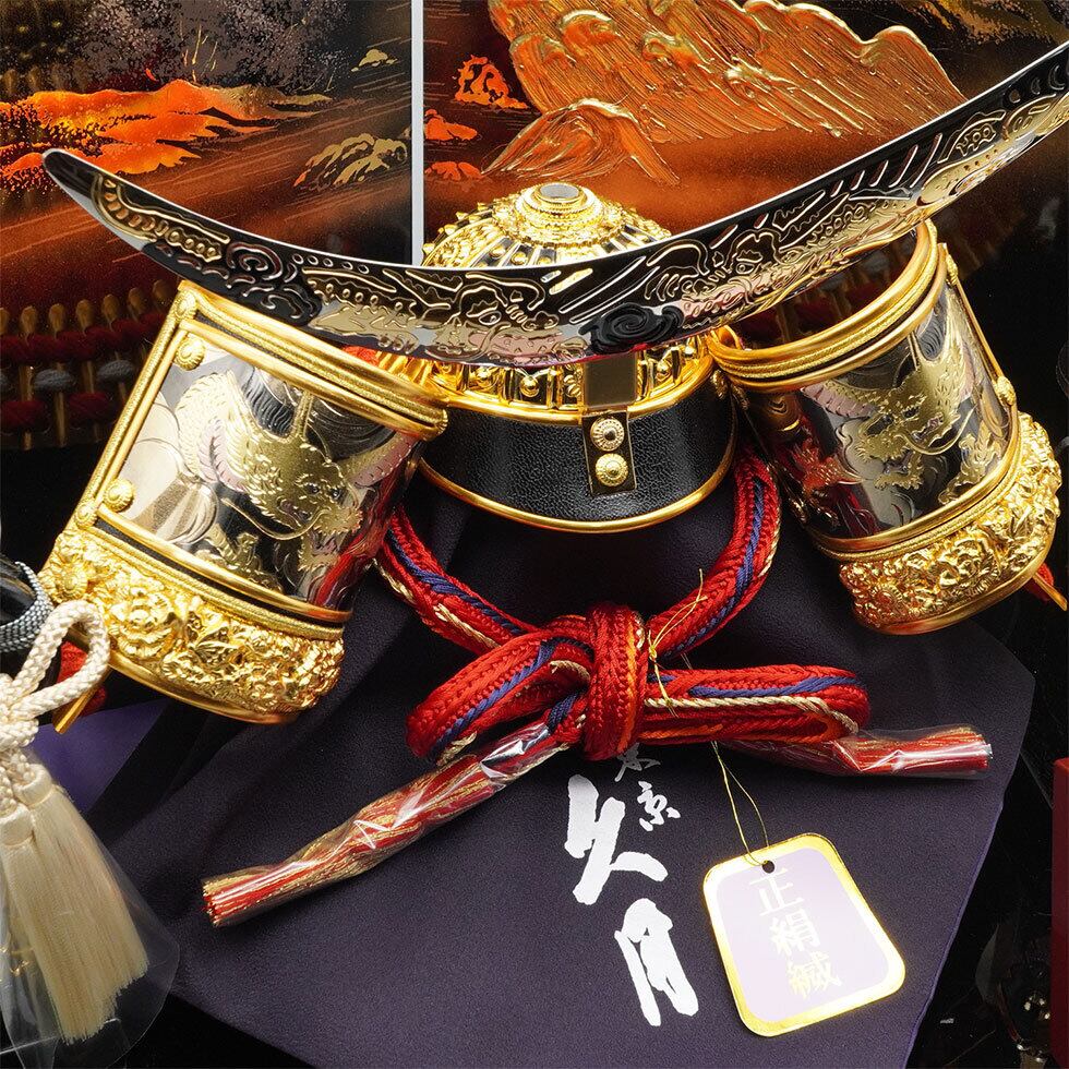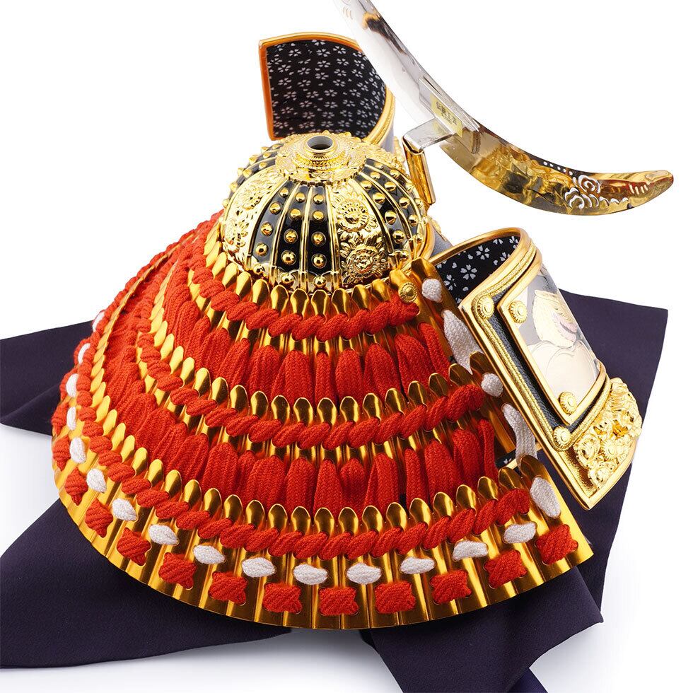 久月作 8号 朱赤糸縅伊達政宗公ノ彫金兜 五重塔二曲屏風収納台飾り 五月人形/端午の節句/子供の日/男の子/コンパクト/人形の久月/家紋