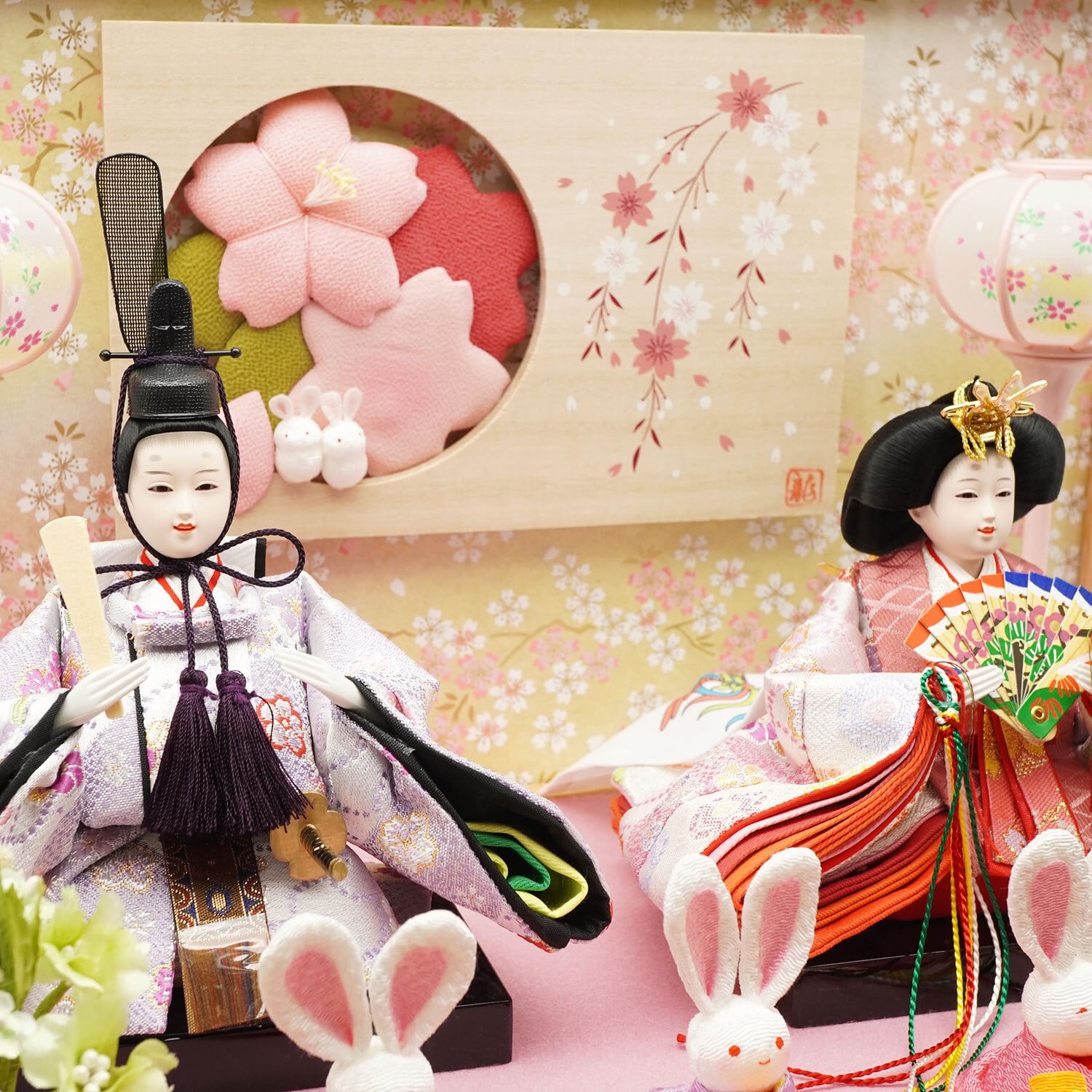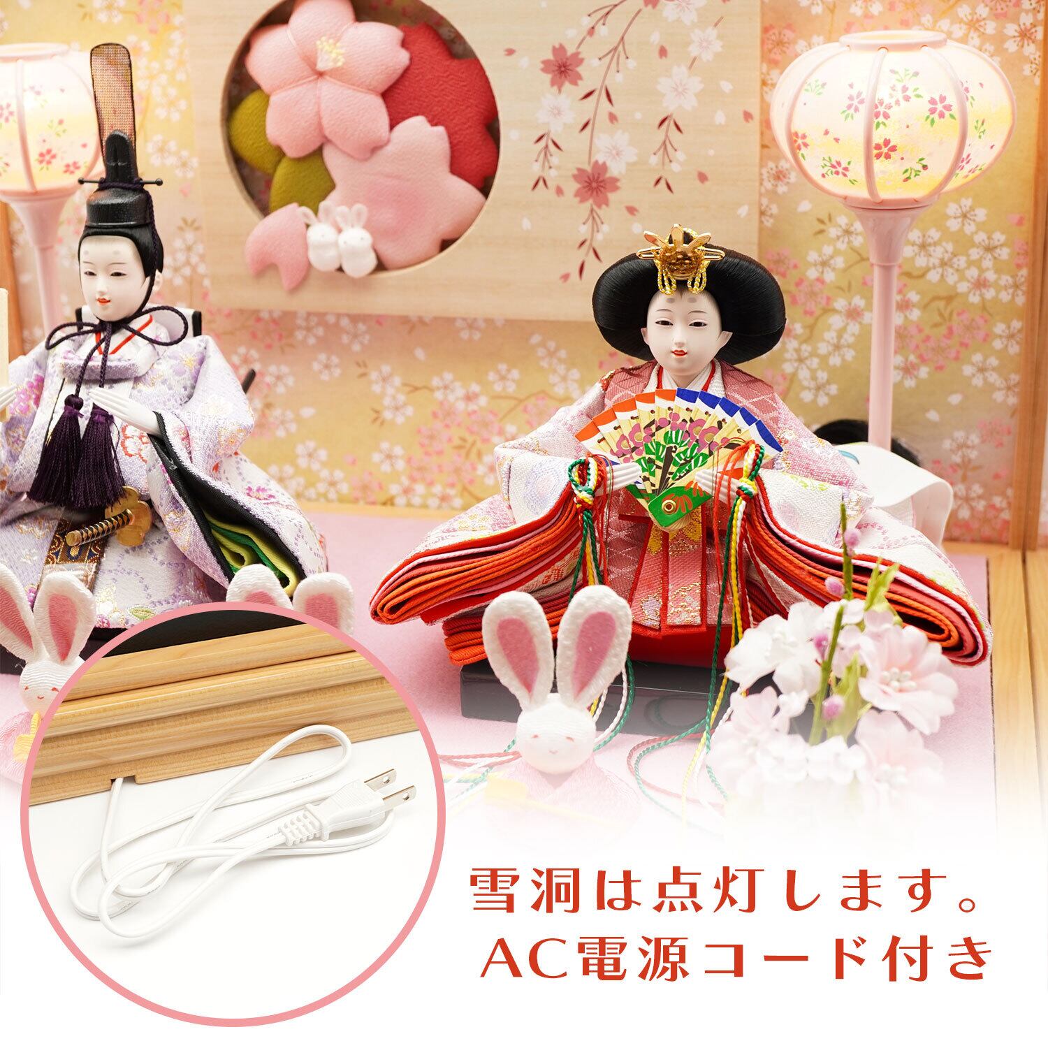 桜の絵柄とちりめんの桜と小さなウサギさんの飾りとピンクの雪洞もポイント、
